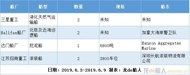 龍船訂單庫(http://imarine.cn/order)統(tǒng)計,2019年6月3日至2019年6月9日報道的新船訂單有7艘船。其中,液化氣船2艘,滾裝船2艘,其它船型3艘。