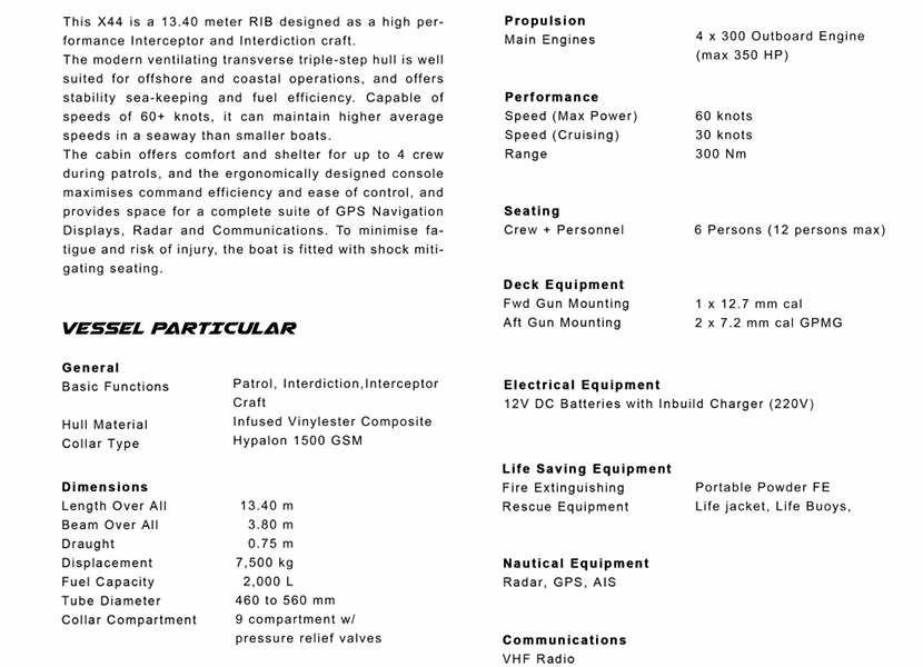 | 燃油容量: | 2.000l | 發(fā)動機功率: | 4x300 outboard engine |