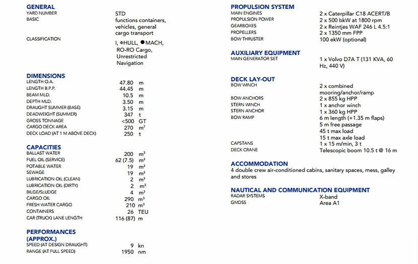 | 發(fā)動(dòng)機(jī)功率: | 2×500bkW at 1800rpm | 推進(jìn)裝置: | 2×1350mmFPP |