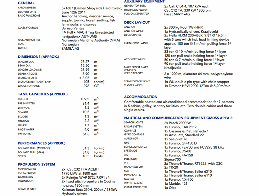 | 發(fā)電機(jī)組: | 2×Cat C32 TTA ACERT | 齒輪箱: | 2×Reintjes WAF 572L |