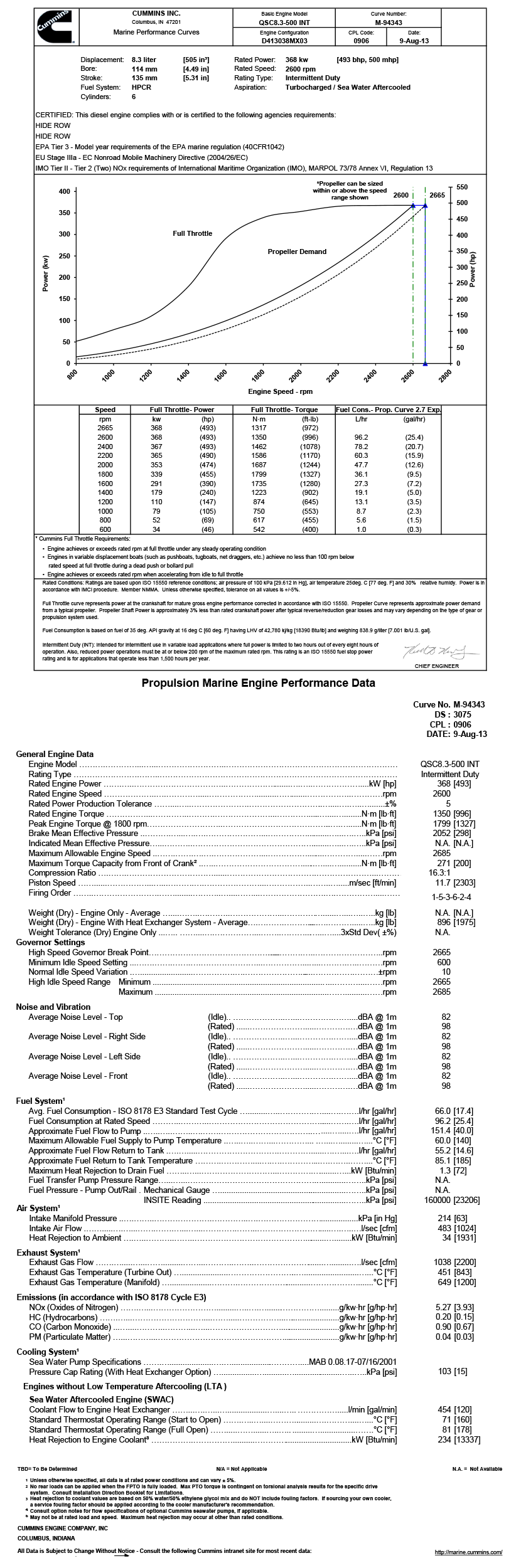 進氣方式: Turbocharged/Sea Water Aftercooled 最大扭矩: 1799N.M(轉速為1800rpm下的最大扭矩)