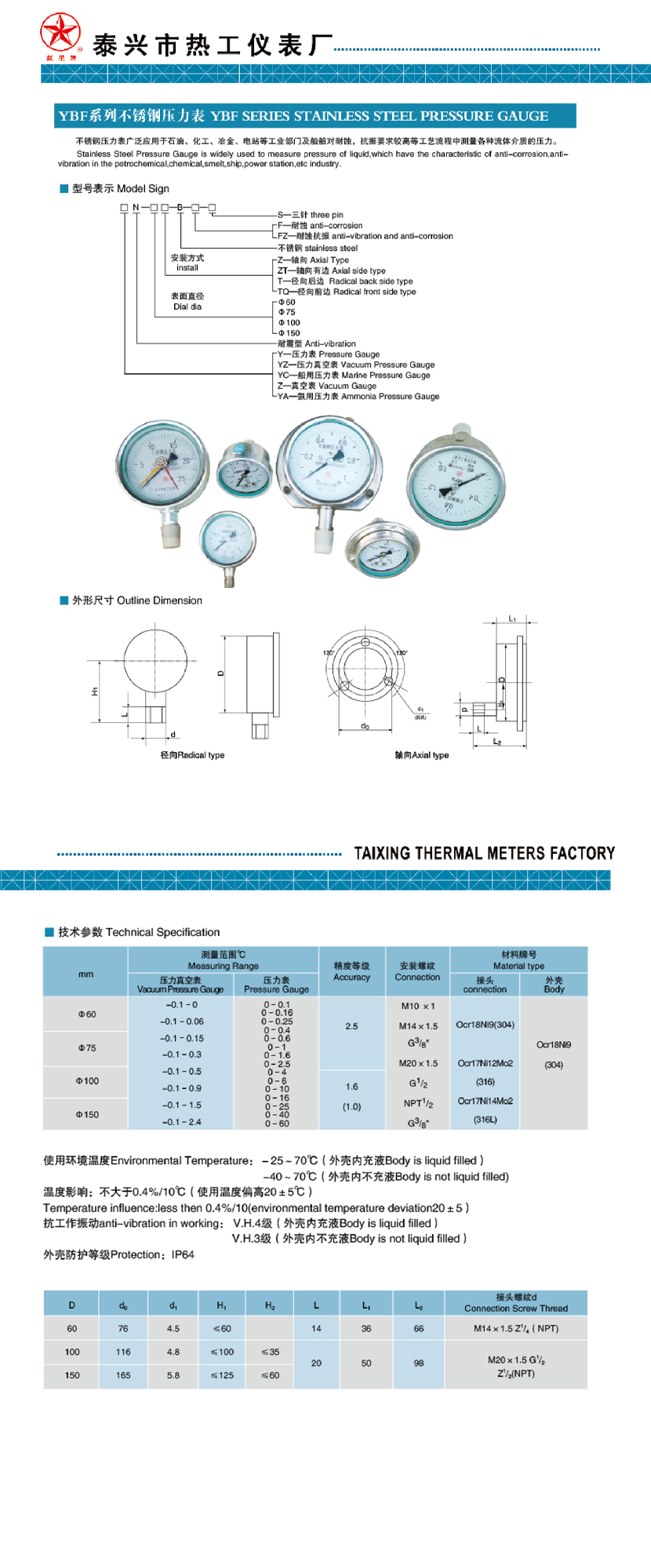 環境溫度: -25~70(外殼內充液)/-40~70(外殼內不充液)℃ 防護等級: IP64