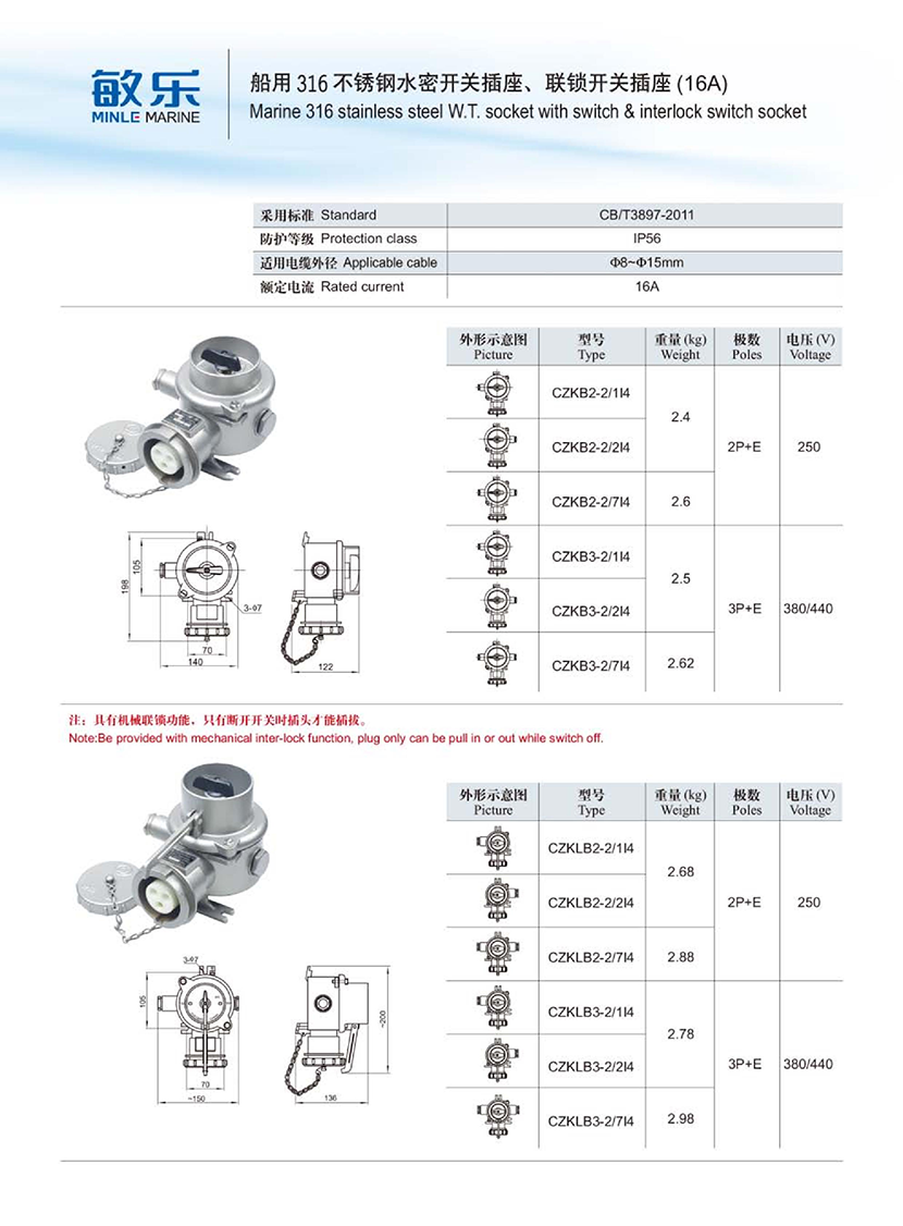 | 船用316不銹鋼水密聯鎖開關插座(16A) | |||