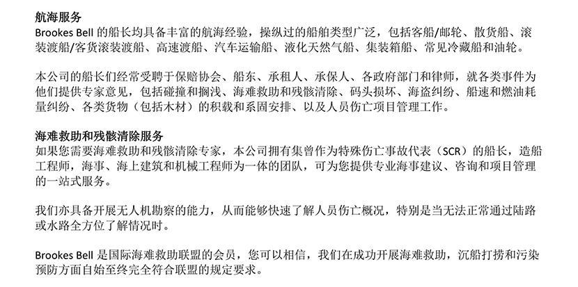 專業優勢: 公司為“國際海難救助聯盟”會員;團隊成員覆蓋專業領域廣且資歷深厚;具備無人機勘察能力;提供從咨詢建議到項目管理與執行處理的一站式服務